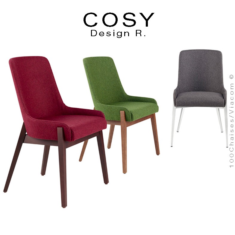 Normes européennesChaise confort ou repas COSY, assise et dossier garnis de mousse polyuréthane, habillage tissu type feutre gamme FLAMENCO du fabricant FIDIVI 100% laine vierge bouillie. Couleur au choix voir palette nuancier. Piétement 4 pieds en tube d'acier section carré 30x30 mm., de forme légèrement conique, finition acier peint ou chromé brillant. Avec tampons plastiques de protection des sols. Convient essentiellement pour l'intérieur. Possibilité habillage deux matières ou deux tons (couleurs), voir palettes images. Vos demandes à commandes@100chaises.fr