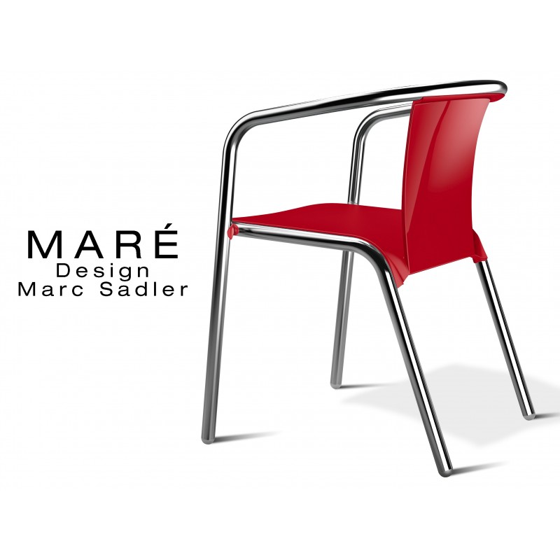 Fauteuil MARÉ, piétement aluminium anodisé, assise coque plastique couleur rouge.