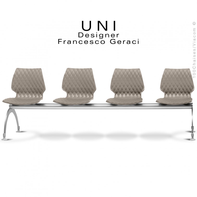 Normes européennesBanc design ou assise sur poutre UNI, 4 places. Piétement plat d'acier épaisseur 8 mm., en forme de U, découpé au laser. Avec tampons plastique de protection des sols réglages. Colonne ou tube de soutien Ø80 mm. Finition peinture au choix voir gamme fabricant. Assise coque plastique effet matelassé en polypropylène, monobloc, teinté dans la masse d'aspect mat côté assise, finition brillante pour le dos. Couleurs disponibles : anthracite - argile - blanche - bleu poudre - gris petit gris - gris Tourterelle - noir - vert Olive - vert Pistache - rouge Corail.