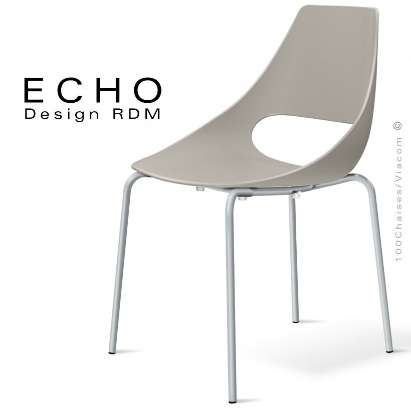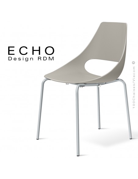 Chaise design esprit seventies ECHO, assise coque plastique en polypropylène composite multicouche, monobloc teinté dans la masse. Couleur disponible blanc, anthracite et gris tourterelle. Piétement 4 pieds en tube d'acier Ø16 mm., finition piétement peinture ou chromé brillant avec bouchons plastiques de protection des sols. Convient essentiellement pour l'intérieur version chromé, finition peinture pour extérieur. Avec option coussin d'assise amovible garnie de mousse polyuréthane, habillage feutre couleur anthracite ou sable. Chaise empilable par 4.