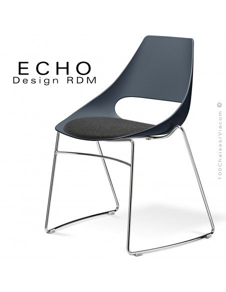 Normes européennesChaise design seventies ECHO, assise coque plastique en polypropylène composite multicouche, monobloc teinté dans la masse. Assise de couleur blanche, anthracite, gris tourterelle. Piétement type luge en rond d'acier Ø10 mm., finition peinture ou chromé brillant au choix. Option avec coussin d'assise amovible garnie de mousse polyuréthane, habillage feutre couleur anthracite ou sable. Convient essentiellement pour l'intérieur, version piétement chromé, version piétement peint pour extérieur. Sur demande piétement avec système d'accroche pour salle de conférence (réf.: ECHO-152-G).