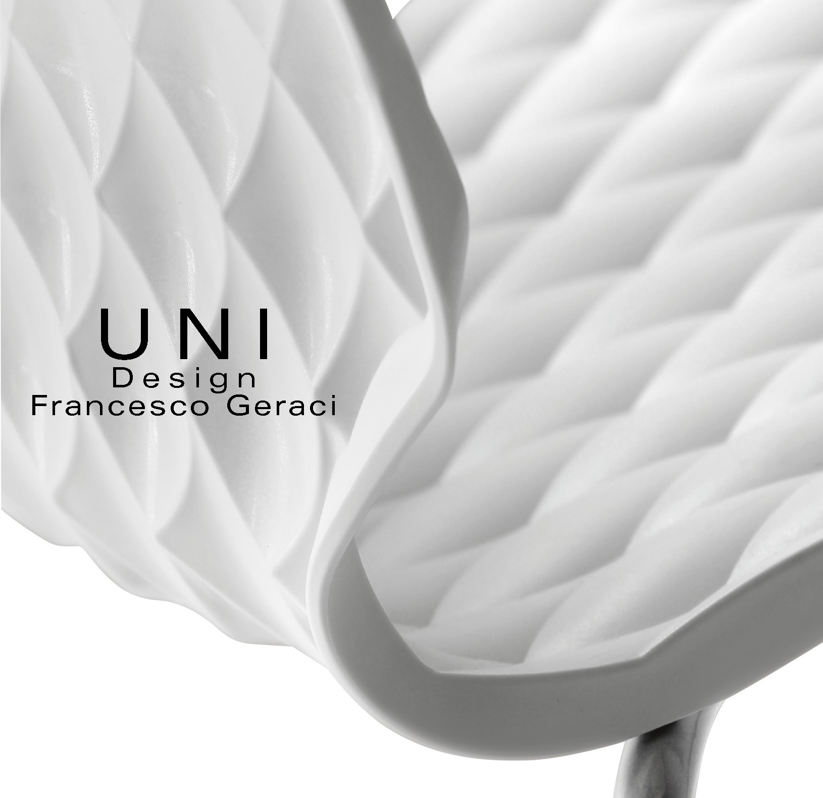Fauteuil design UNI, assise coque plastique effet matelassé de couleur en polypropylène, monobloc, teinté dans la masse. Couleurs disponibles : anthracite - argile - blanche - bleu poudre - gris petit gris - gris Tourterelle - noir - vert Olive - vert Pistache - rouge Corail de couleur voir palette au choix. Piétement 4 pieds en tube d'acier Ø16 mm., avec accoudoirs, finition peint au choix voir palette (image) ou chromé brillant. Avec tampons plastiques de protection des sols. Convient essentiellement pour l'intérieur en version chromé, pour l'extérieur finition peinture, empilable - Lot de 4 pièces.