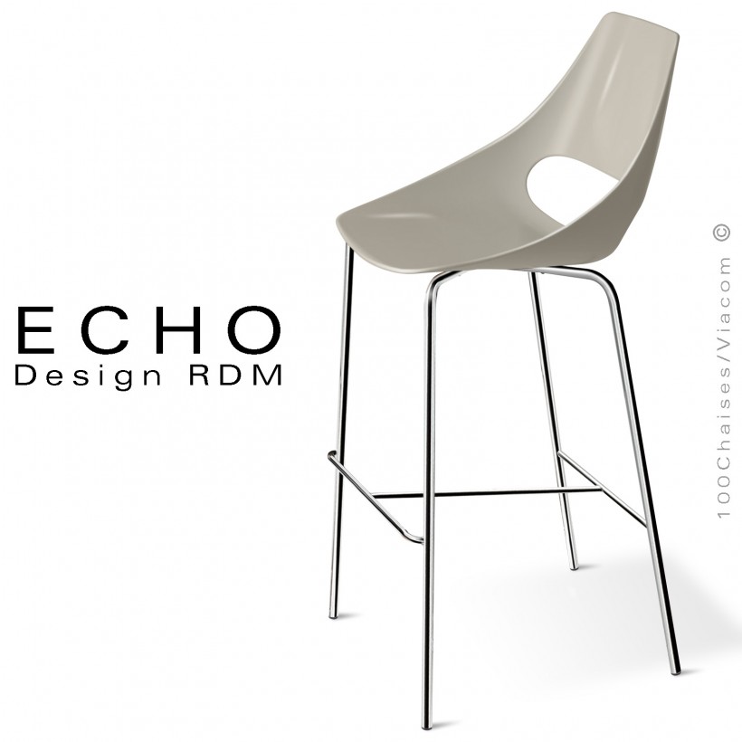 Tabouret de bar design seventies ECHO, assise coque plastique en polypropylène composite multicouche, monobloc teinté dans la masse. Couleur assise blanche, anthracite, gris Tourterelle. Piétement 4 pieds en tube d'acier Ø10 mm., finition acier chromé brillant ou peint au choix. Avec repose-pieds et tampons plastique de protections des sols. Avec option coussin d'assise amovible garnie de mousse polyuréthane, habillage tissu type feutre de couleurs anthracite ou sable. Convient essentiellement pour l'intérieur pour le piétement chromé.