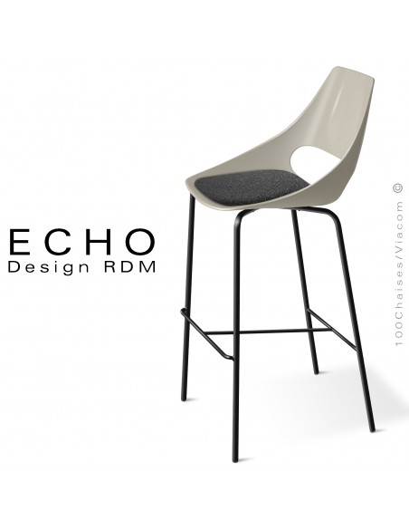 Normes européennesTabouret de bar design seventies ECHO, assise coque plastique en polypropylène composite multicouche, monobloc teinté dans la masse. Couleur assise blanche, anthracite, gris Tourterelle. Piétement 4 pieds en tube d'acier Ø10 mm., finition acier chromé brillant ou peint au choix. Avec repose-pieds et tampons plastique de protections des sols. Avec option coussin d'assise amovible garnie de mousse polyuréthane, habillage tissu type feutre de couleurs anthracite ou sable. Convient essentiellement pour l'intérieur pour le piétement chromé.