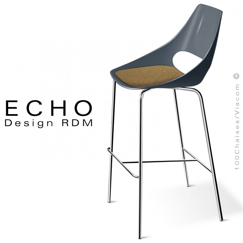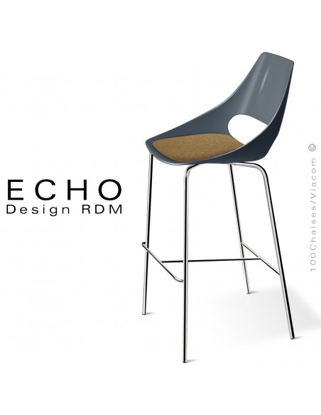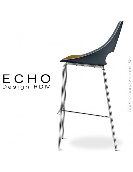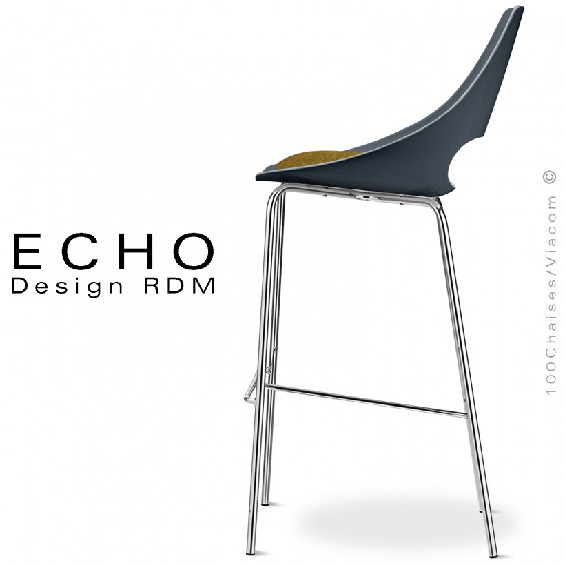 Tabouret de bar design seventies ECHO, assise coque plastique en polypropylène composite multicouche, monobloc teinté dans la masse. Couleur assise blanche, anthracite, gris Tourterelle. Piétement 4 pieds en tube d'acier Ø10 mm., finition acier chromé brillant ou peint au choix. Avec repose-pieds et tampons plastique de protections des sols. Avec option coussin d'assise amovible garnie de mousse polyuréthane, habillage tissu type feutre de couleurs anthracite ou sable. Convient essentiellement pour l'intérieur pour le piétement chromé.
