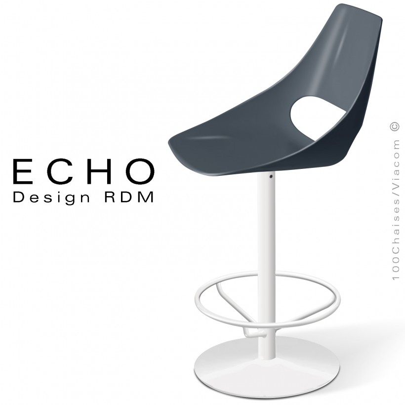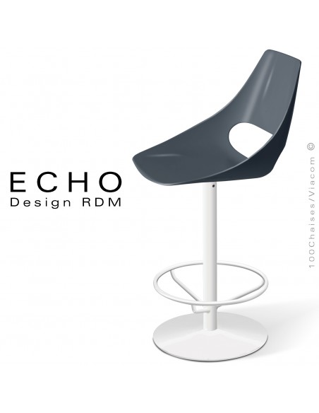 Tabouret de cuisine design esprit seventies ECHO, assise coque plastique en polypropylène composite multicouche, monobloc, teinté dans la masse. Assise de couleur blanche, anthracite, gris tourterelle. Piétement colonne centrale en tube d'acier Ø76 mm., platine de sol ou base Ø420 mm., avec repose-pieds. Finition piétement peint ou chromé brillant. Convient essentiellement pour l'intérieur. Assise pivotante à 360°. Avec tampons plastiques de protections des sols. Option coussin amovible mousse + tissu type feutre de couleur anthracite ou sable. Disponible avec embase pour fixation au sol sur demande à commandes@100chaises.fr