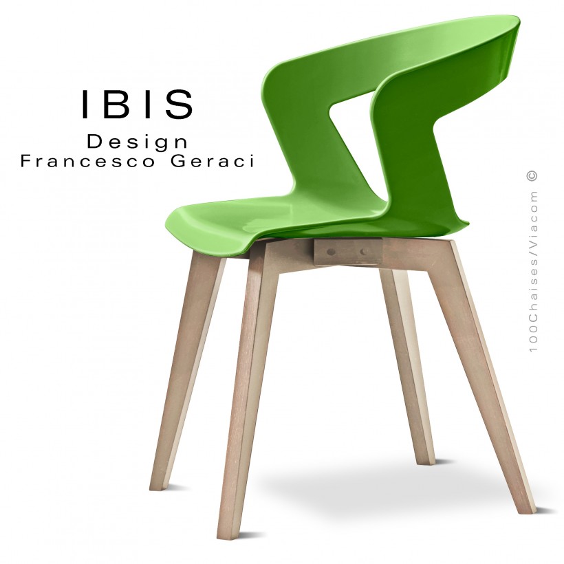 Chaise IBIS, piétement bois de hêtre vernis ou teinté miel, assise coque couleur vert pomme.