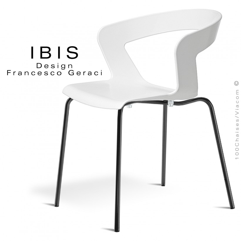 Chaise design IBIS assise coque plastique monobloc (techno-polymère) teinté dans la masse, couleur, anthracite, blanche, gris, gris Tourterelle, ivoire, orange, verte voir palette au choix. Piétement 4 pieds en tube d'acier Ø16 mm., finition chromé brillant ou peint, noir, blanc, anthracite, marron (ou autre couleur sur demande voir palette peinture piétement) avec bouchons plastique de protection des sols. Convient essentiellement pour l'intérieur, mobilier empilable. En option coussin feutre amovible couleurs anthracite ou sable.