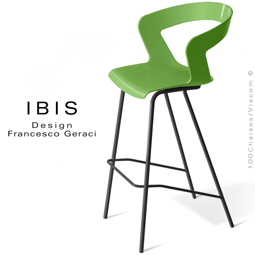 Tabouret design pour bar IBIS, piétement peint noir, assise coque couleur vert pomme.