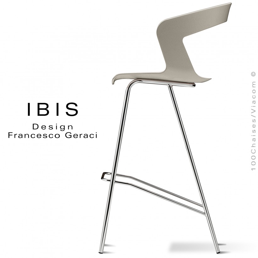 Tabouret design pour bar IBIS, piétement chromé brillant, assise coque couleur gris tourterelle.