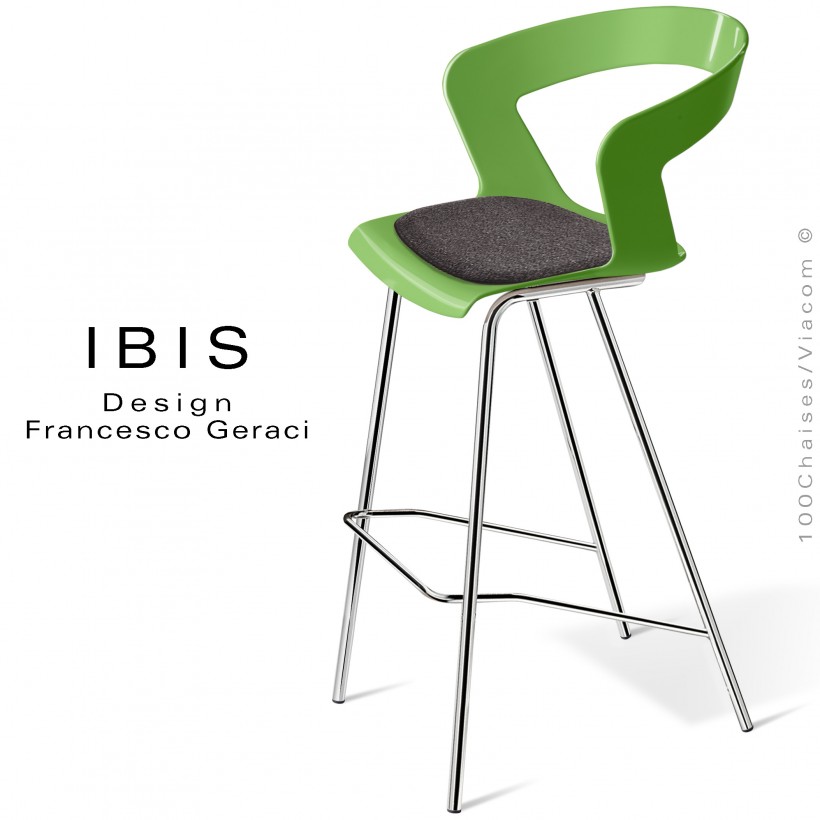 Tabouret de bar design IBIS, assise coque plastique couleur avec coussin, piétement chromé brillant ou peint.