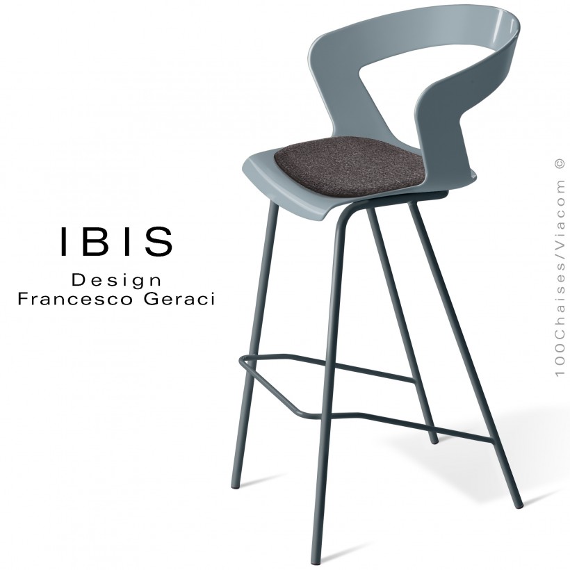 Tabouret design pour bar IBIS, piétement peint anthracite, assise coque couleur gris avec coussin feutre anthracite.
