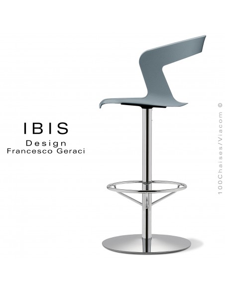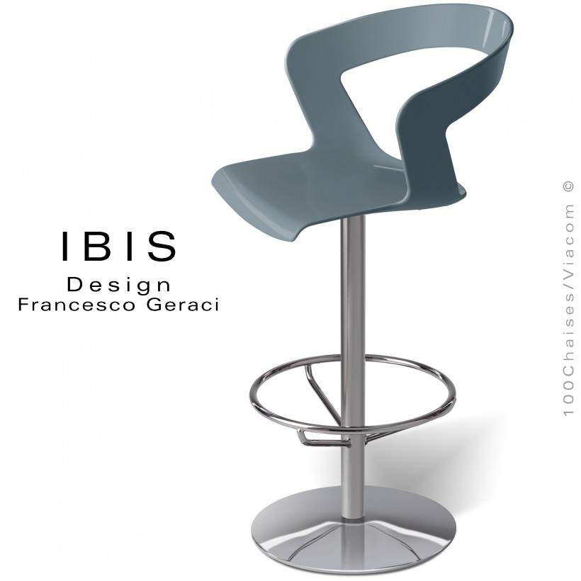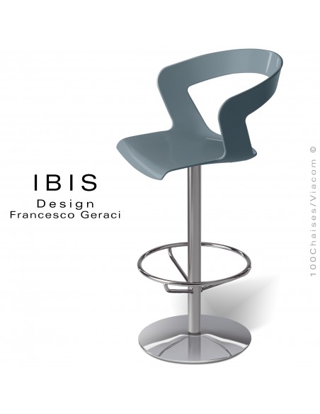 Tabouret de bar design IBIS, assise pivotante 360°, coque plastique en polypropylène, monobloc teinté dans la masse. Assise couleurs anthracite, blanche, gris petit gris, orange, vert pomme ivoire, gris tourterelle. Piétement colonne centrale en tube d'acier Ø76 mm., sur platine de sol base Ø420 mm., avec repose-pieds. Finition structure chromé brillant ou peint voir palette au choix. Avec coussin d'assise amovible en feutre de couleur noir ou sable. Convient essentiellement pour l'intérieur - Vos demandes à commandes@100chaises.fr