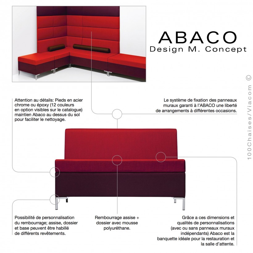 Liberté de composition… ABACO est le système de banquette modulable : la collection comporte, poufs, banquettes droites et d'angle, courbes concave et convexe ainsi que les modules de revêtements muraux, sont les éléments d'un produit au service de la conception et de la créativité. Les modules linéaires d’angle et les panneaux muraux rembourrés sont un système flexible et modulable qui, grâce aux différentes tailles disponibles, vous permettent de configurer et de décorer tout espace. La possibilité de combiner 3 couleurs de revêtement pour la base, l’assise et le dossier ainsi que celle des panneaux muraux permet de jouer sur des effets chromatiques importants qui vous permettent d'harmoniser avec l'environnement et le projet.