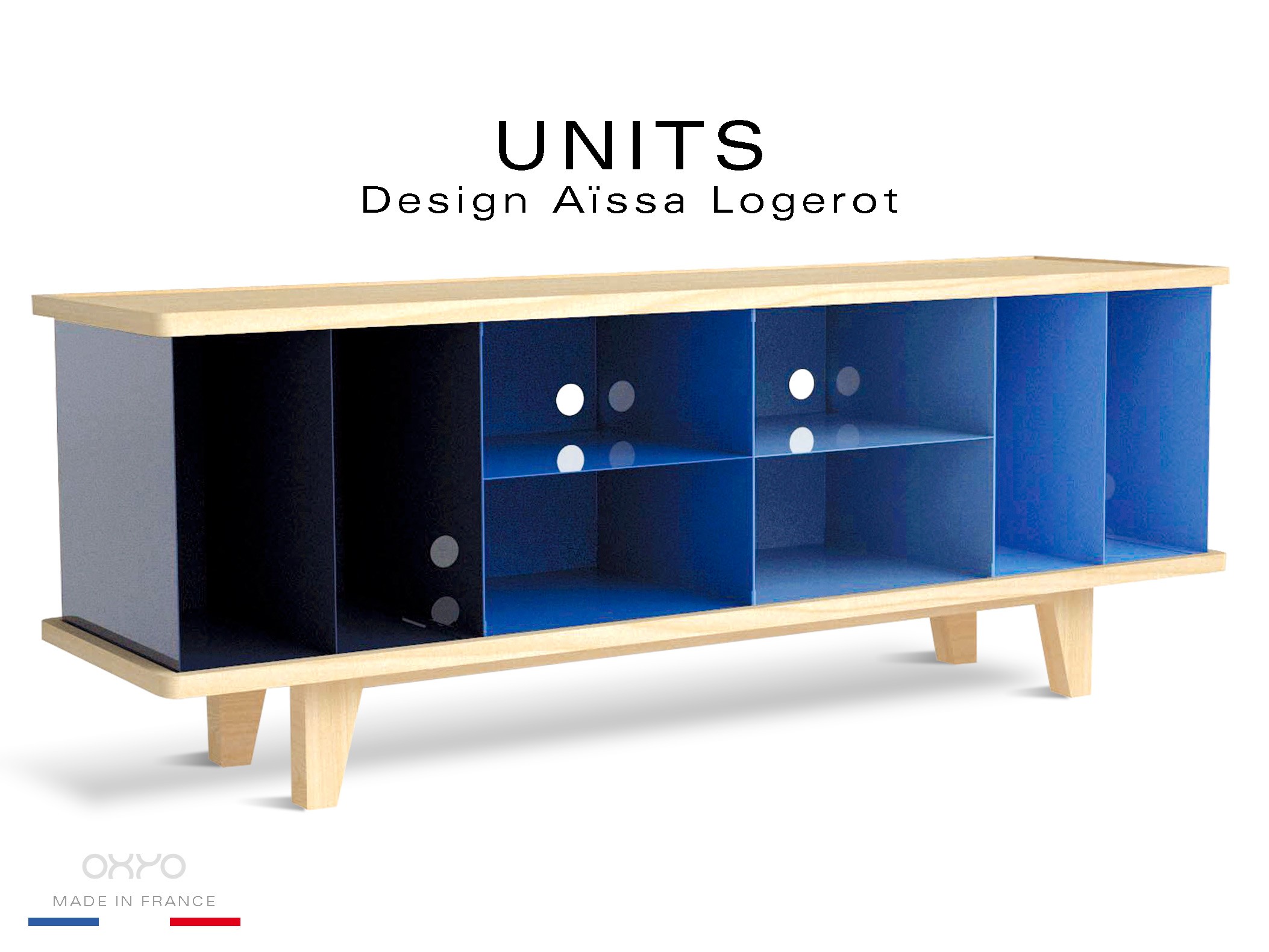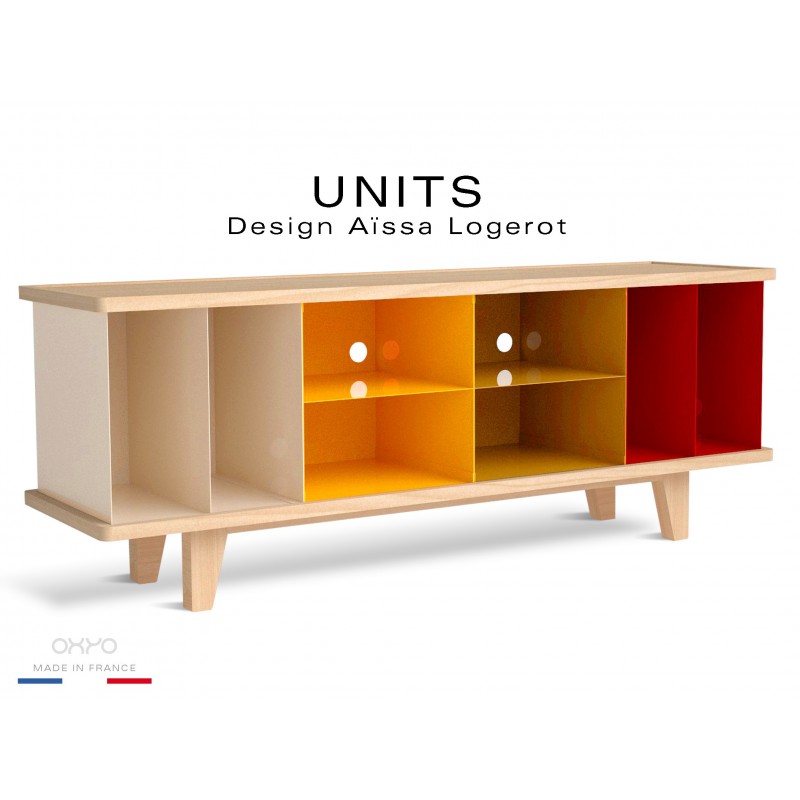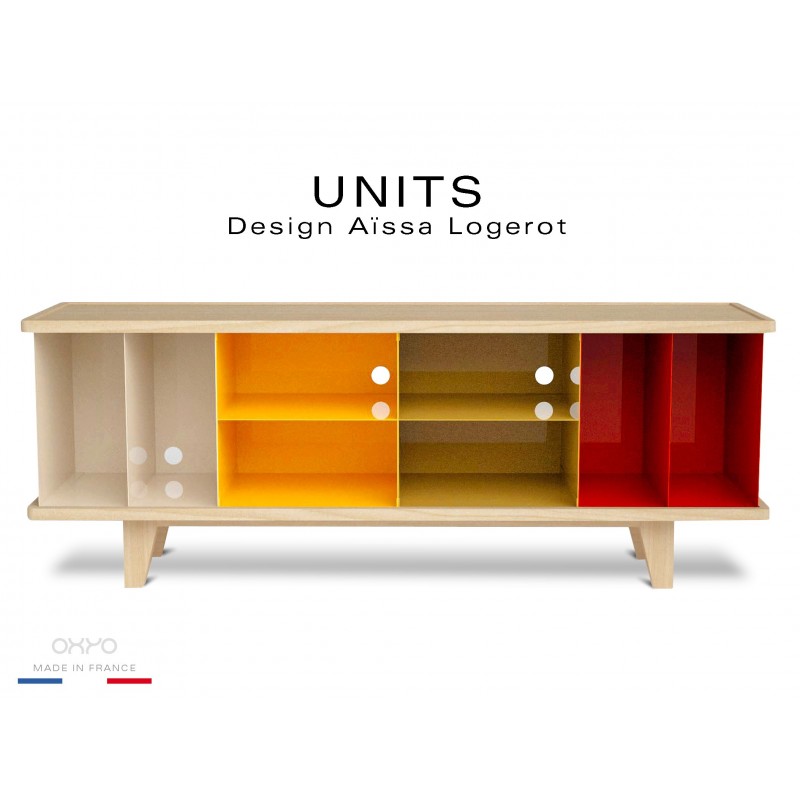 Buffet, commode ou bahut, UNITS se compose d'une structure à quatre pieds et d'un plateau supérieur en bois de hêtre massif, avec une finition vernis incolore ou naturel. En son centre, quatre caissons modulables en tôle d'acier peint, ils sont dotés de perforations pour les systèmes de câblage électrique ou Hi-Fi. Dimensions : L. 148,5 x H. 55,6 x P. 40 cm.
