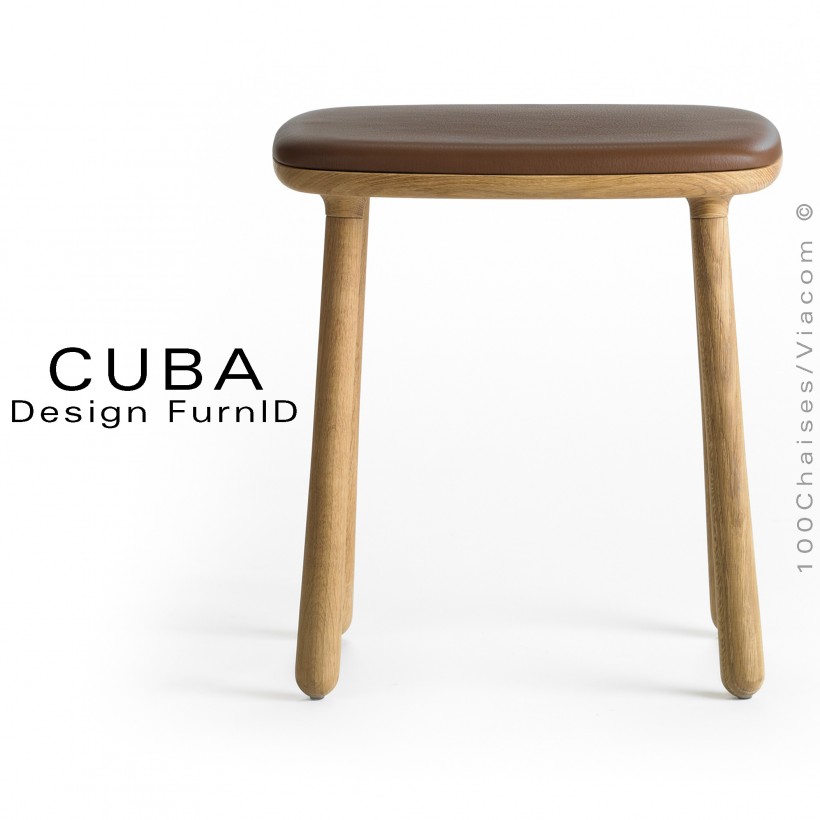 Normes européennesTabouret bois design CUBA-46 CUIR, structure 4 pieds rond, légèrement conique en bois de chêne massif, finition huilé naturel ou teinté noir. Avec tampons plastiques de protection des sols. Assise garnie de mousse polyuréthane à haute résilience afin d'éviter tout risque d'affaissement. Habillage cuir gamme Sydney du fabricant CAMO, en standard trois teintes possibles, Cognac, brun foncé (marron), noir.