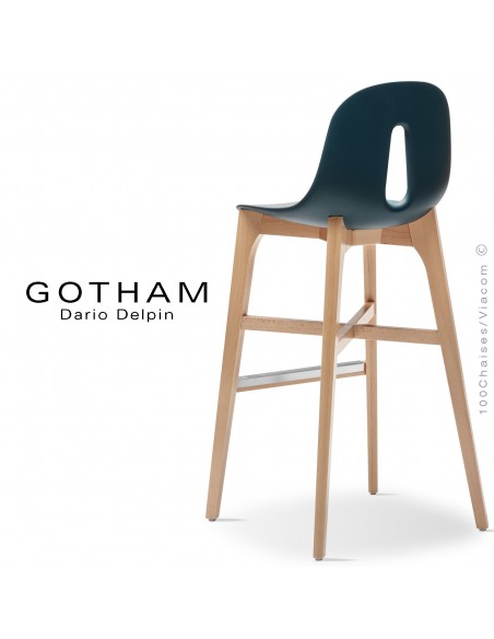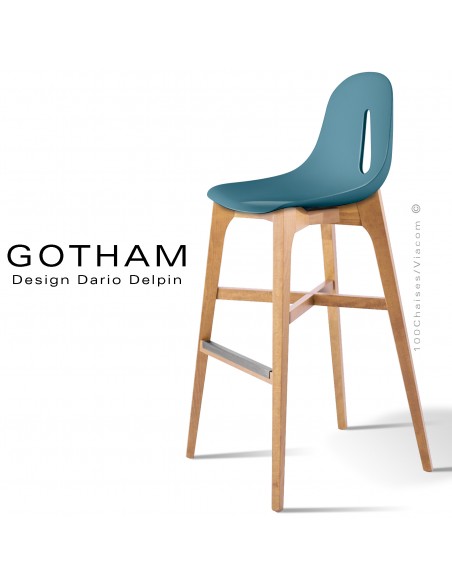 Tabouret de bar GOTHAM-W-SG-80, piétement bois naturel, assise coque plastique bleu pétrole.