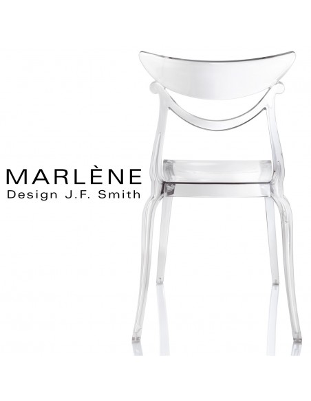Chaise design MARLÈNE structure 4 pieds plastique transparente en polycarbonate d'aspect brillant, monobloc, teinté dans la masse. Design innovant "So chic", ajoute une note d'élégance dans votre cuisine terrasse ou salle de restaurant. Structure d'aspect brillant, technologie de moulage à l'air moulding. Résistante et légère, convient aux espaces intérieur ou extérieur, empilable. Avec tampons plastiques de protection des sols.