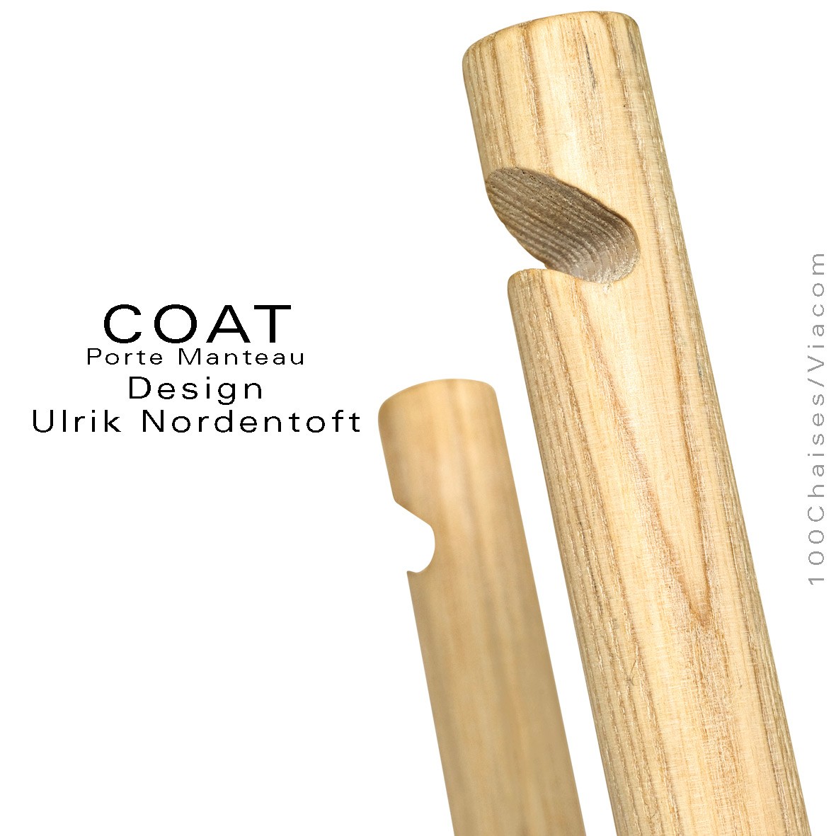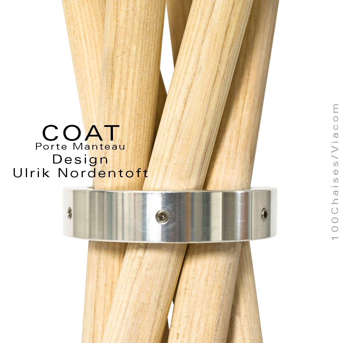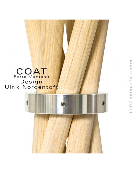 Normes européennesPorte manteau design COAT, minimaliste en bois de frêne massif, évoquant un fagot, composé de 6 tiges d'une hauteur de 165 cm., et d'un diamètre de 2 cm. Maintenu par cerclage ou cintrage des six tiges grâce à un anneau ou bague d'aluminium. Empatement globale au sol Ø46 cm. Deux finitions possible frêne huilé naturel ou teinté noir.
