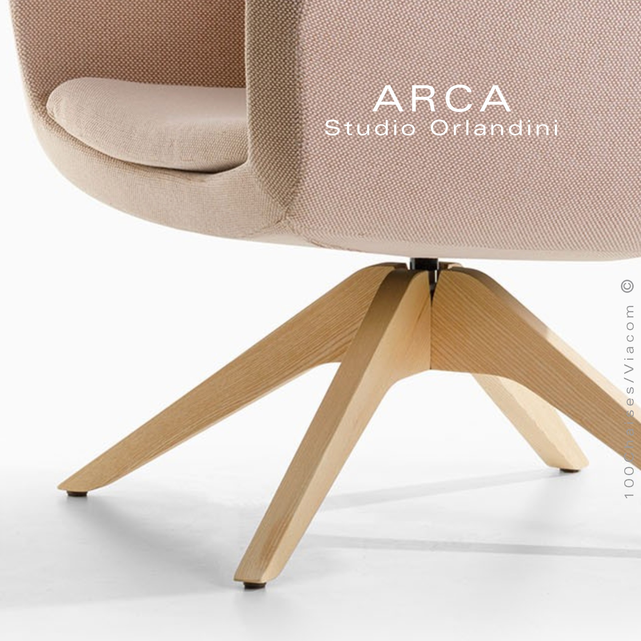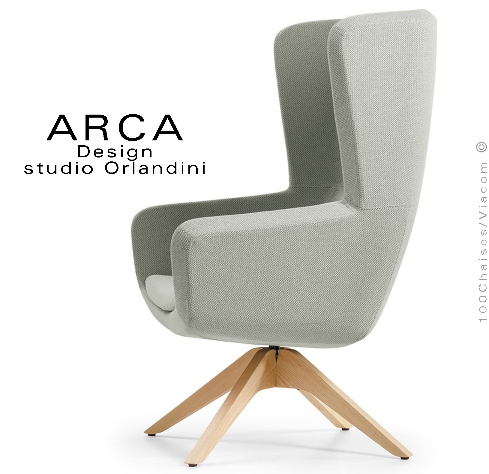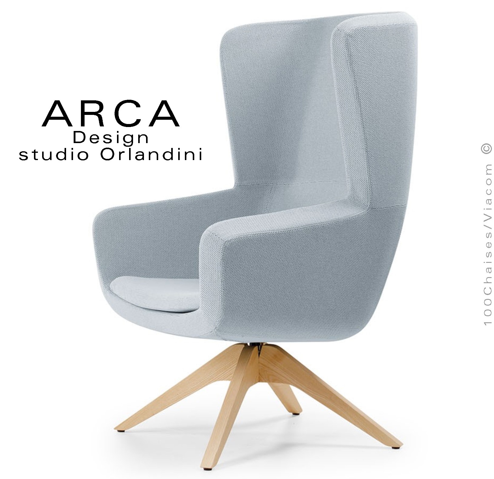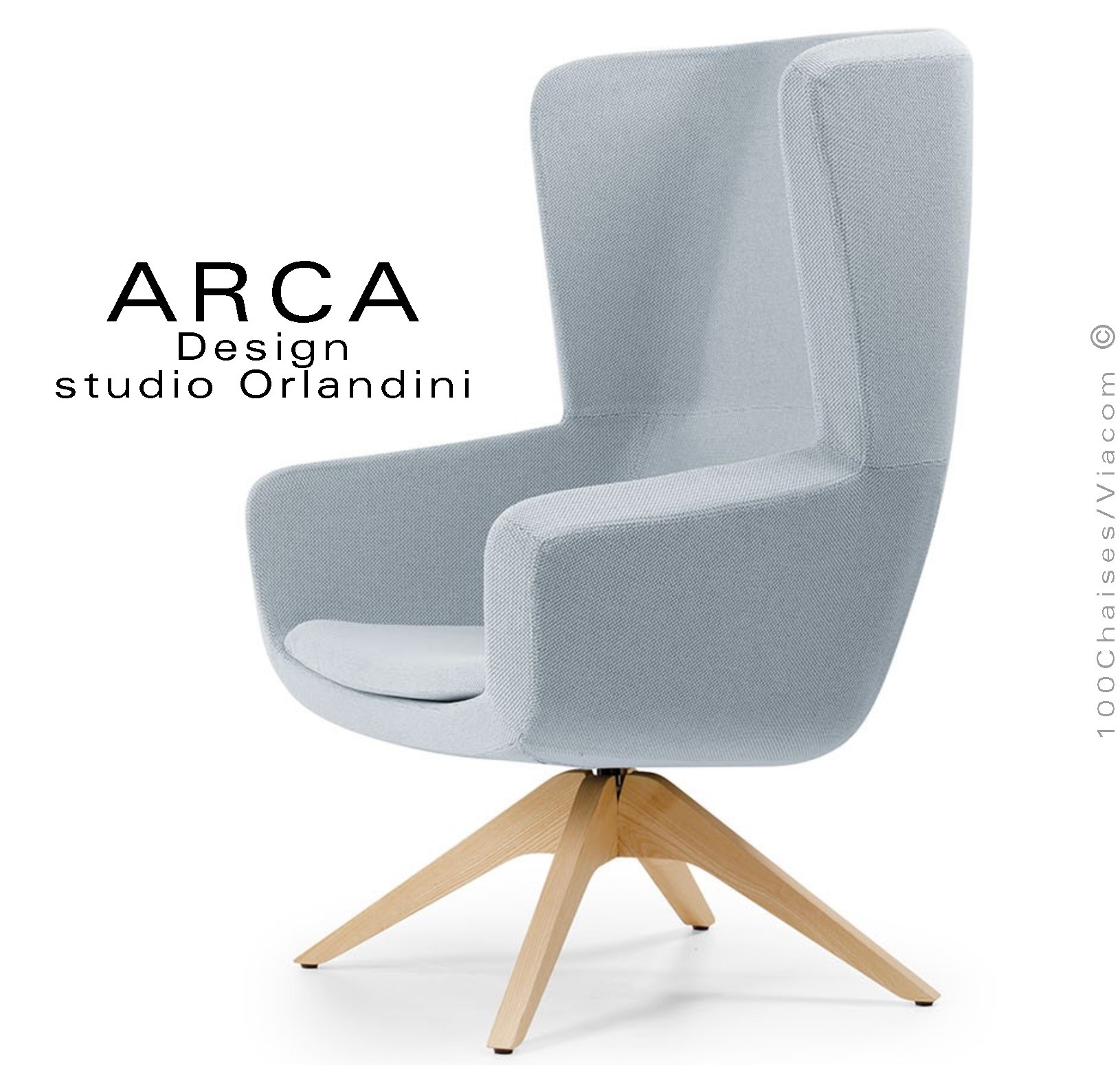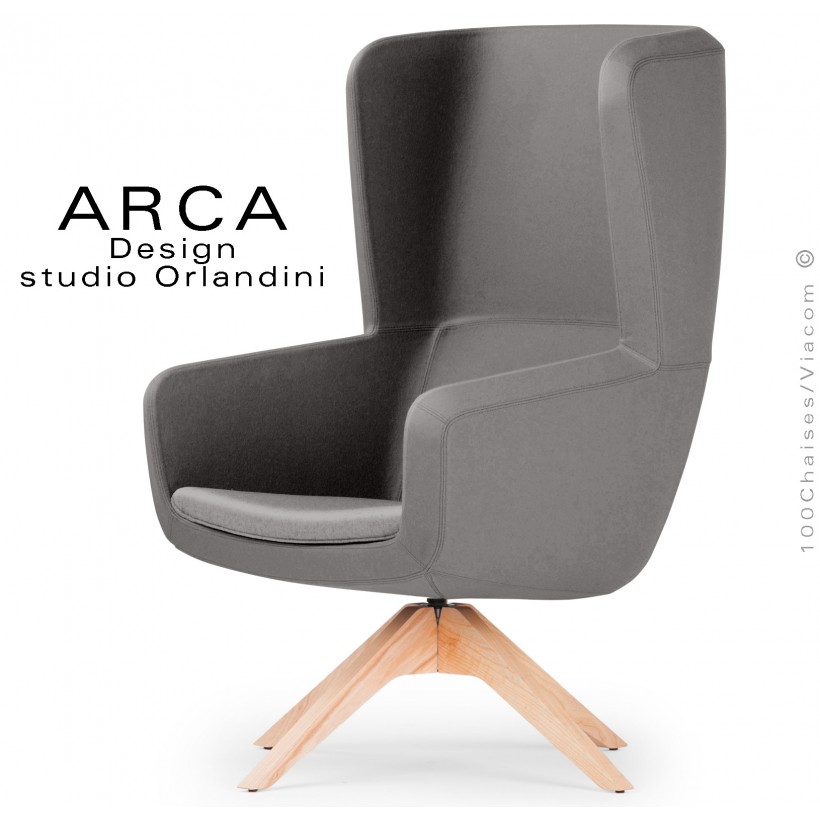 Fauteuil lounge pour salon d'attente standing ARCA, structure interne en acier associée à un rembourrage en mousse moulée et injectée à froid. Dossier haut. Piétement à quatre branches en bois massif de Frêne, finition vernis naturel ou peint (autre sur demande voir palette peinture). Piétement avec tampons plastiques de protection des sols. Fauteuil pivotant à 360°, avec système de retour automatique. Habillage tissu tissé gamme ERA du fabricant Camira, composition 100% polyester. Flammabilité : EN 1021 - 1 (cigarette) - EN 1021 - 2 (allumette).