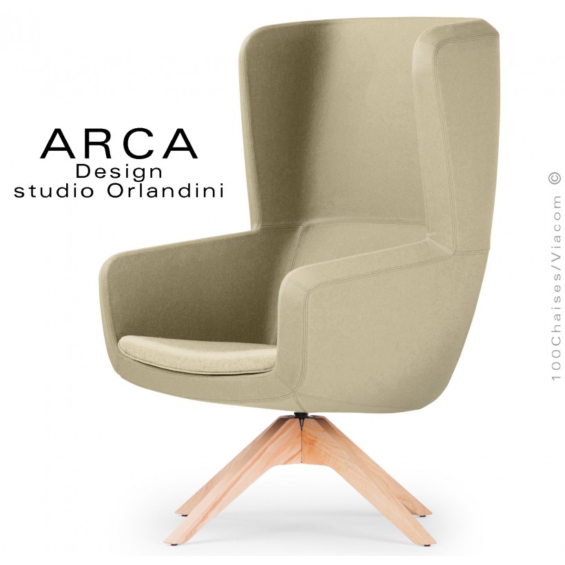 Fauteuil lounge pour salon d'attente standing ARCA, structure interne en acier associée à un rembourrage en mousse moulée et injectée à froid. Dossier haut. Piétement à quatre branches en bois massif de Frêne, finition vernis naturel ou peint (autre sur demande voir palette peinture). Piétement avec tampons plastiques de protection des sols. Fauteuil pivotant à 360°, avec système de retour automatique. Habillage tissu tissé gamme ERA du fabricant Camira, composition 100% polyester. Flammabilité : EN 1021 - 1 (cigarette) - EN 1021 - 2 (allumette).