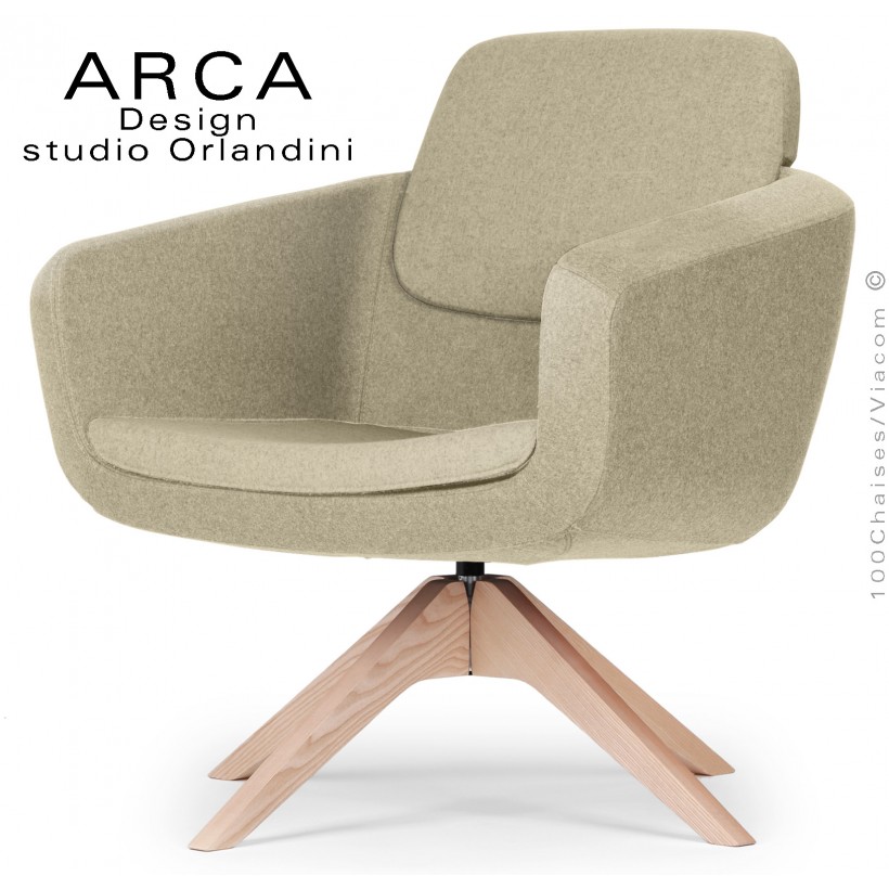 Fauteuil pour espace d'accueil lounge ARCA, structure interne en acier, assise et dossier garnis de mousse polyuréthane moulée et injectée à froid. Habillage tissu tissé gamme ERA du fabricant Camira, composition 100% polyester. Piétement 4 branches bois massif de Frêne. Assise pivotant à 306° avec système de retour automatique. Avec tampons plastiques de protection des sols. Option possible tablette écritoire ou habillage tissu deux tons (deux couleurs).