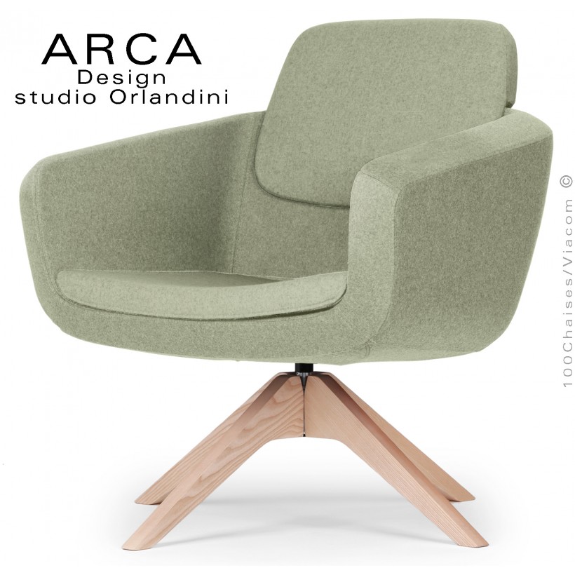 Fauteuil pour espace d'accueil lounge ARCA, structure interne en acier, assise et dossier garnis de mousse polyuréthane moulée et injectée à froid. Habillage tissu tissé gamme ERA du fabricant Camira, composition 100% polyester. Piétement 4 branches bois massif de Frêne. Assise pivotant à 306° avec système de retour automatique. Avec tampons plastiques de protection des sols. Option possible tablette écritoire ou habillage tissu deux tons (deux couleurs).