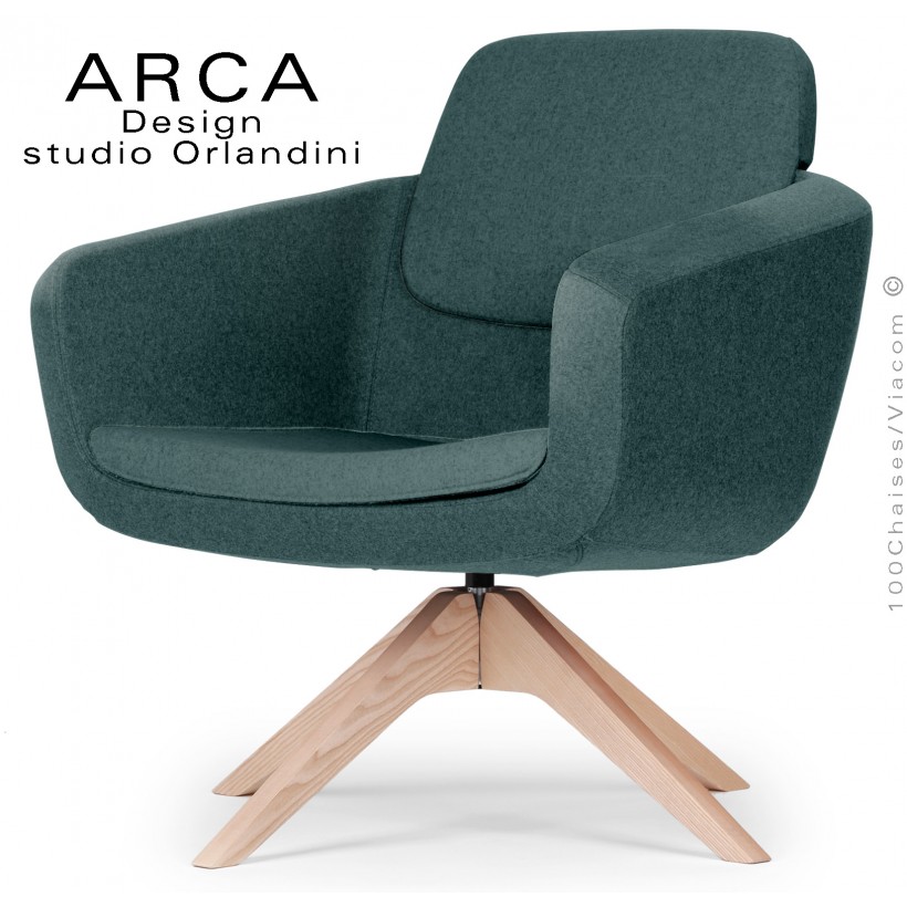 Fauteuil pour espace d'accueil lounge ARCA, structure interne en acier, assise et dossier garnis de mousse polyuréthane moulée et injectée à froid. Habillage tissu tissé gamme ERA du fabricant Camira, composition 100% polyester. Piétement 4 branches bois massif de Frêne. Assise pivotant à 306° avec système de retour automatique. Avec tampons plastiques de protection des sols. Option possible tablette écritoire ou habillage tissu deux tons (deux couleurs).