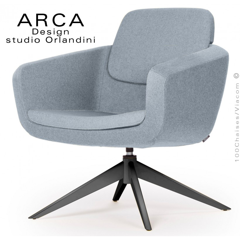 Fauteuil pour salon d'attente lounge ARCA, structure interne acier, assise et dossier garnis de mousse moulée et injectée à froid. Piétement 4 branches acier peint noir en standard. Assise pivotant avec système de retour automatique. Habillage assise et dossier tissu tissé gamme ERA du fabricant Camira, 100% polyester (couleur aux choix voir palette fabricant). Tablette écritoire en option sur demande de couleur blanche ou noir.