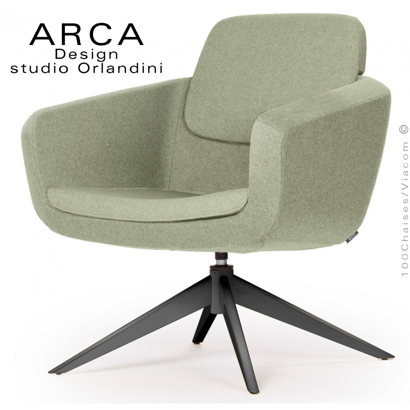 Fauteuil pour salon d'attente lounge ARCA, structure interne acier, assise et dossier garnis de mousse moulée et injectée à froid. Piétement 4 branches acier peint noir en standard. Assise pivotant avec système de retour automatique. Habillage assise et dossier tissu tissé gamme ERA du fabricant Camira, 100% polyester (couleur aux choix voir palette fabricant). Tablette écritoire en option sur demande de couleur blanche ou noir. Autre option assise et dossier deux tons, deux couleurs.