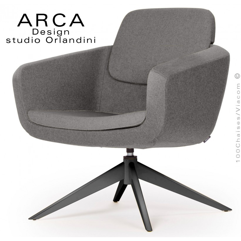 Fauteuil pour salon d'attente lounge ARCA, structure interne acier, assise et dossier garnis de mousse moulée et injectée à froid. Piétement 4 branches acier peint noir en standard. Assise pivotant avec système de retour automatique. Habillage assise et dossier tissu tissé gamme ERA du fabricant Camira, 100% polyester (couleur aux choix voir palette fabricant). Tablette écritoire en option sur demande de couleur blanche ou noir.