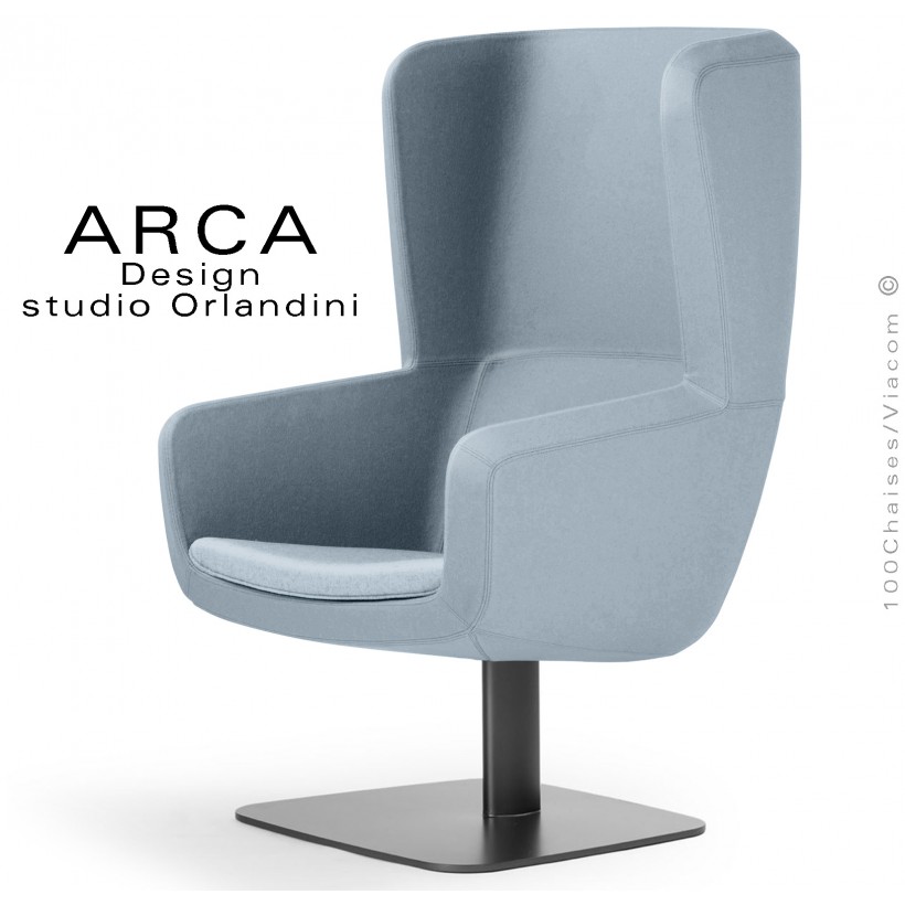 Fauteuil lounge ARCA, pour salon d'attente, habillage tissu couleur bleu clair, piétement colonne centrale acier peint noir.