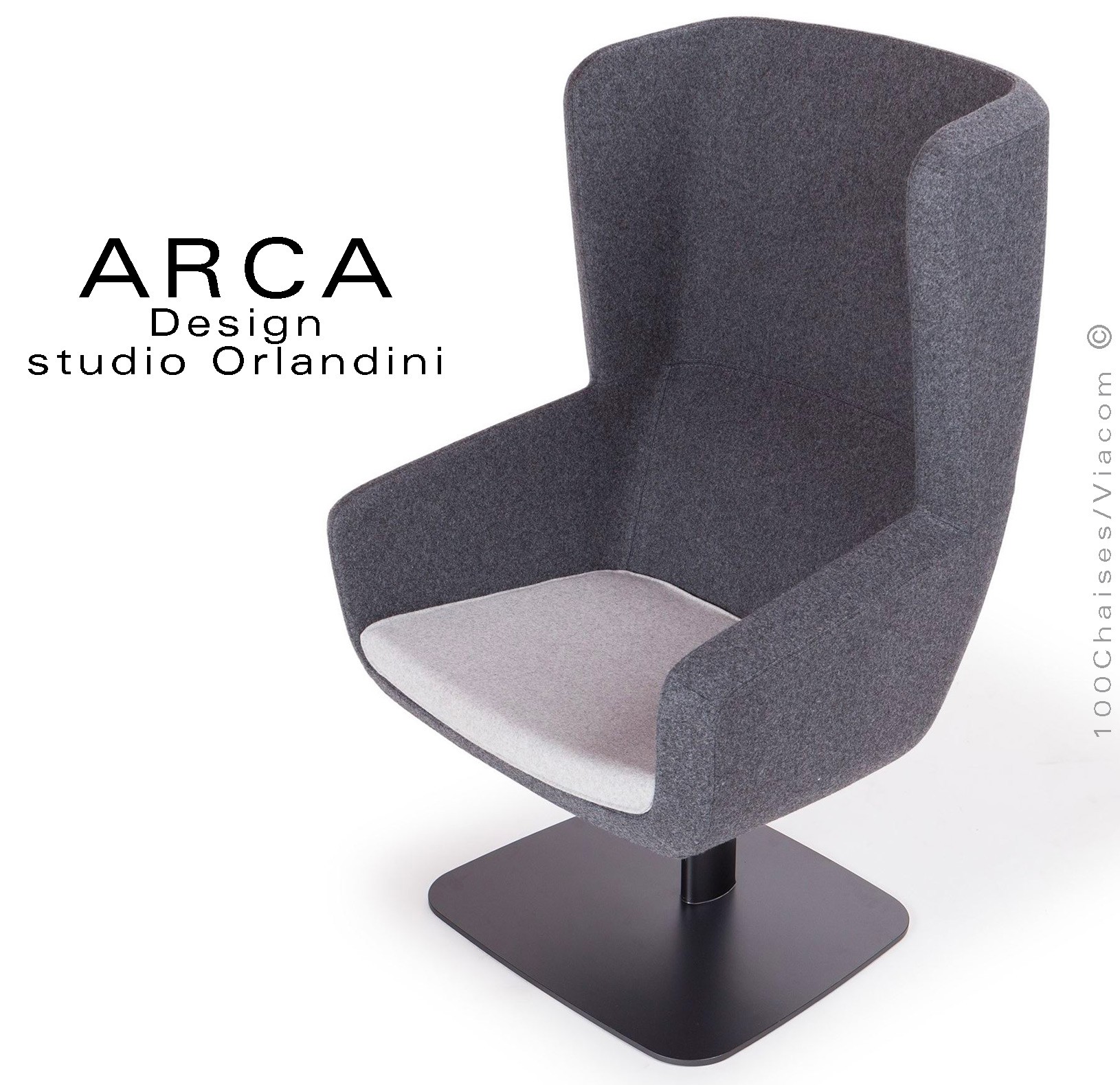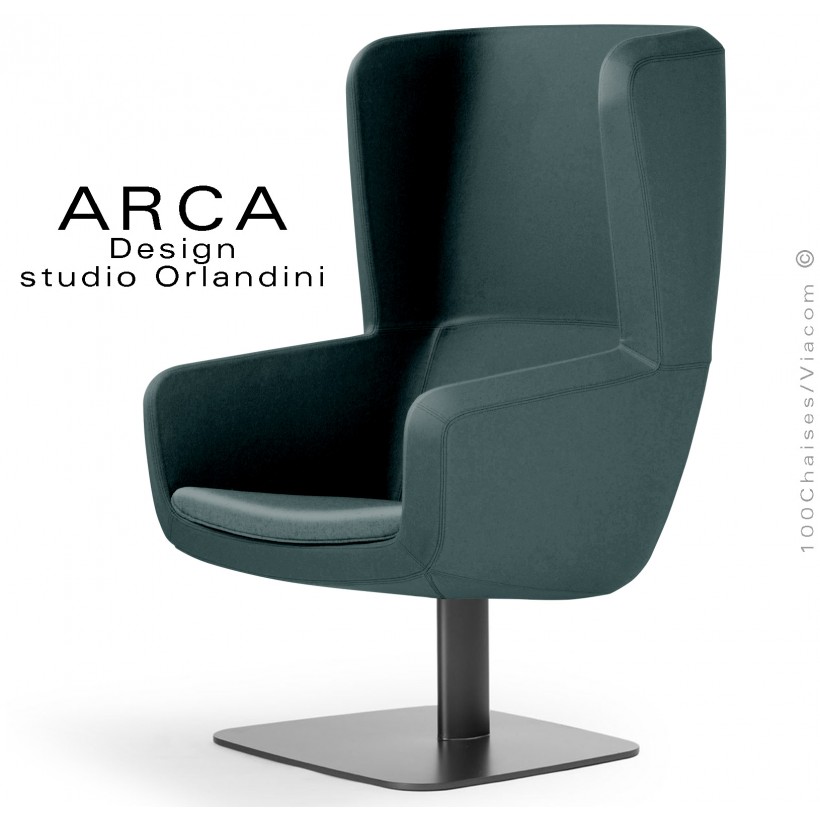 Fauteuil lounge pour salon d'attente standing ARCA, structure interne en acier associée à un rembourrage en mousse moulée et injectée à froid. Piétement colonne centrale ovoïde sur platine de sol acier peint noir en standard (autre sur demande voir palette peinture). Piétement avec tampons plastiques de protection des sols. Habillage tissu tissé gamme ERA du fabricant Camira, composition 100% polyester. Flammabilité : EN 1021 - 1 (cigarette) - EN 1021 - 2 (allumette).