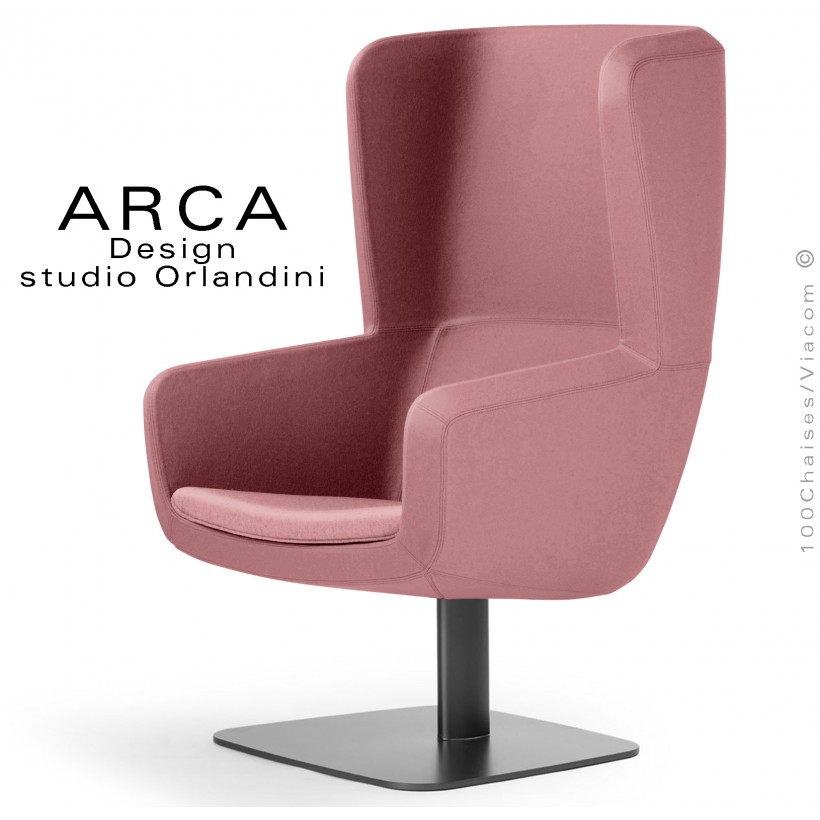 Fauteuil lounge ARCA, pour salon d'attente, habillage tissu couleur rose, piétement colonne centrale acier peint noir.