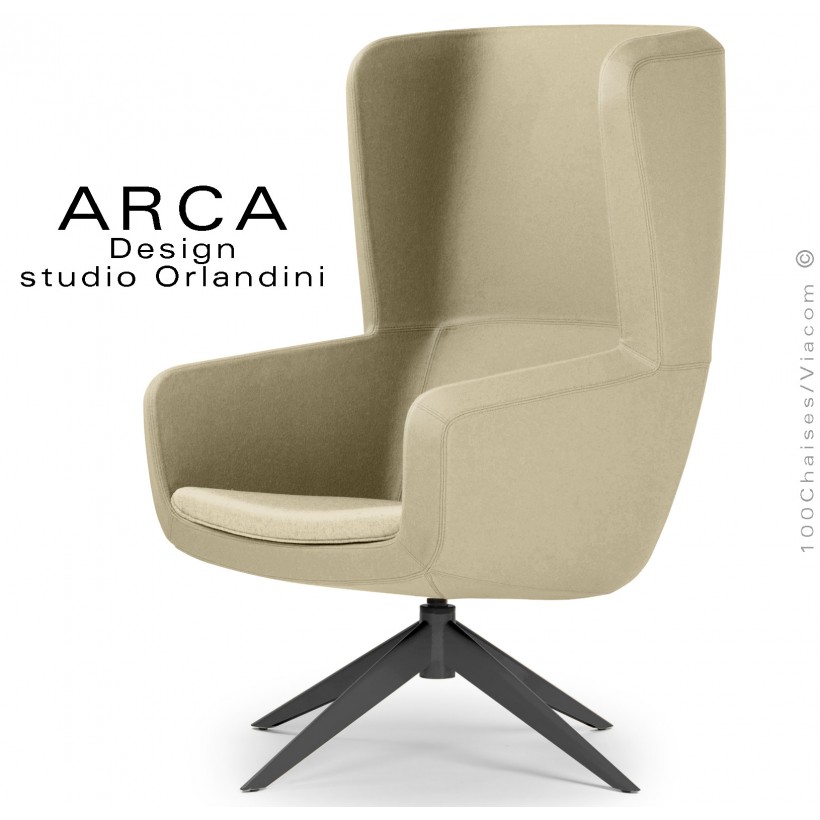 Fauteuil lounge pour salon d'attente standing ARCA, structure interne en acier associée à un rembourrage en mousse moulée et injectée à froid. Piétement à quatre branches en acier peint noir en standard (autre sur demande voir palette peinture). Piétement avec tampons plastiques de protection des sols. Fauteuil pivotant à 360°, avec système de retour automatique. Habillage tissu tissé gamme ERA du fabricant Camira, composition 100% polyester. Flammabilité : EN 1021 - 1 (cigarette) - EN 1021 - 2 (allumette).