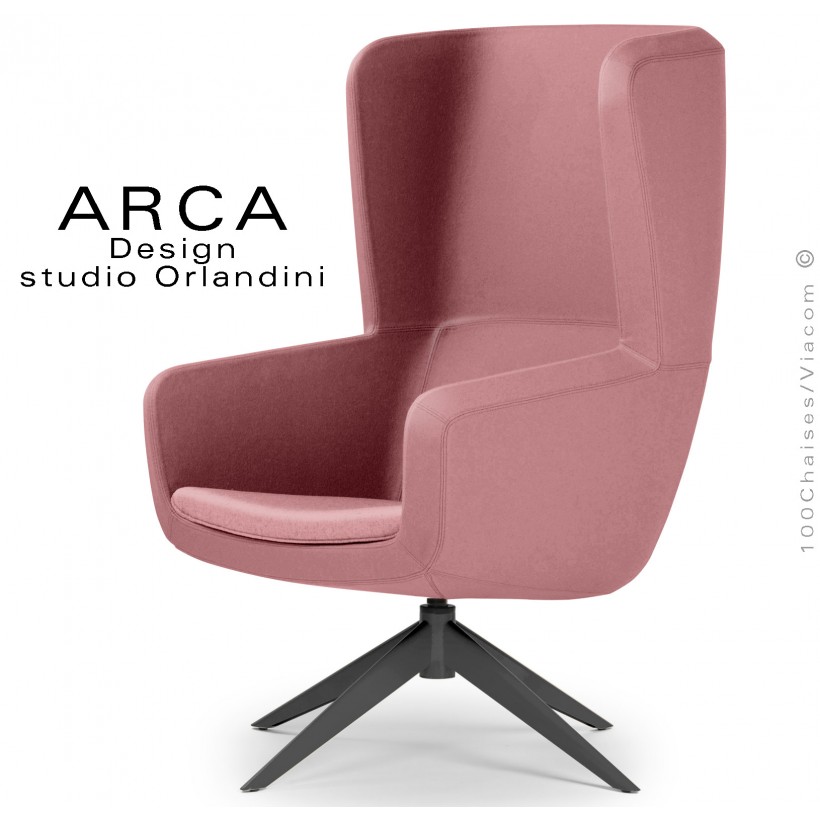 Fauteuil lounge confort ARCA, pour salon d'attente standing, habillage tissu couleur rose, piétement peint noir.