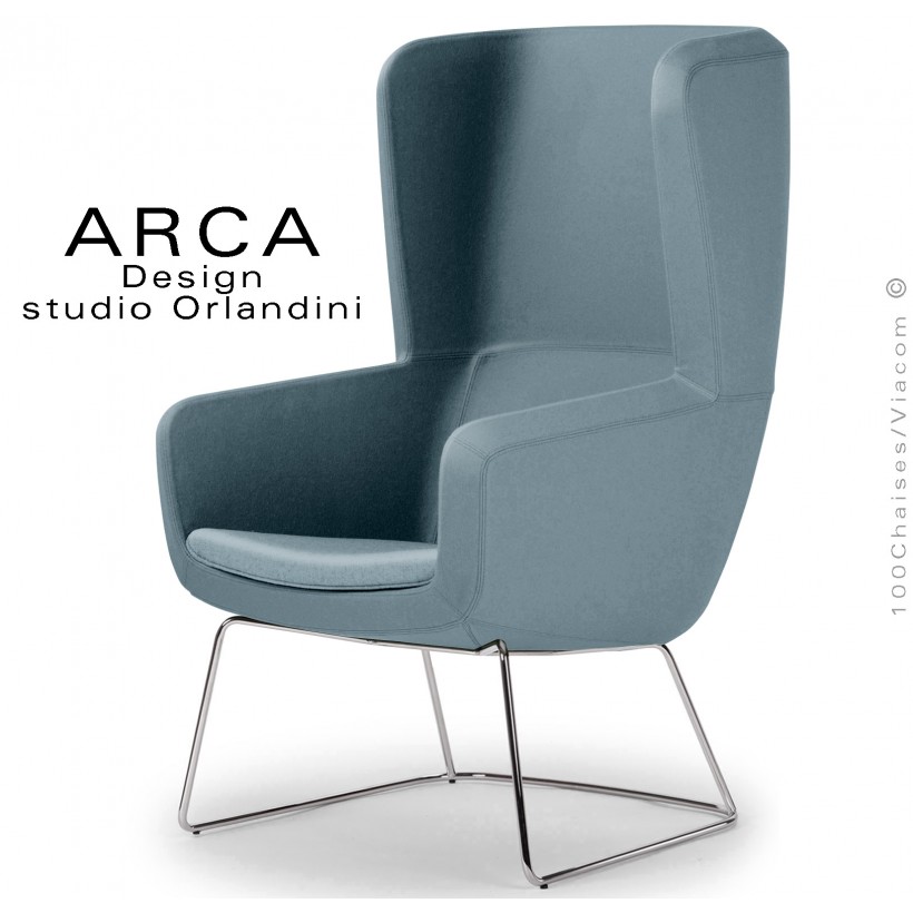 Fauteuil lounge confort ARCA, pour salon d'attente standing, habillage tissu bleu d'eau piétement luge chromé brillant.