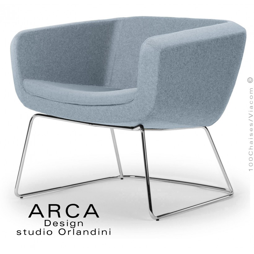 Fauteuil lounge pour salle d'attente ARCA, piétement luge chromé brillant, habillage tissu couleur bleu clair.