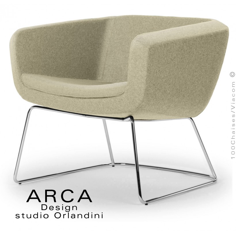 Fauteuil lounge pour salle d'attente ARCA, piétement luge chromé brillant ou peint, habillage tissu tissé 100% polyester.