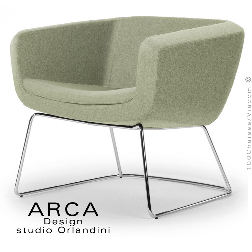 Fauteuil lounge pour salle d'attente ARCA, piétement luge chromé brillant, habillage tissu couleur vert clair.