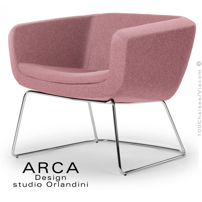 Fauteuil lounge pour salon d'attente standing ARCA, structure interne en acier associée à un rembourrage en mousse moulée et injectée à froid. Piétement type luge en rond ou fil d'acier Ø15 mm., avec tampons plastiques de protection des sols.Finition piétement chromé brillant ou peint noir en standard, autre sur demande en fonction de la palette fabricant. Assise et dossier habillage tissu tissé gamme ERA du fabricant Camira, composition 100% polyester. Flammabilité : EN 1021 - 1 (cigarette) - EN 1021 - 2 (allumette).