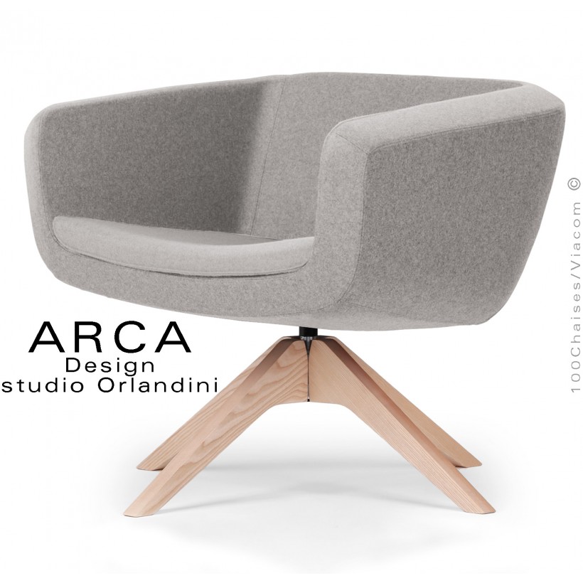 Fauteuil pour espace d'accueil lounge ARCA, structure interne en acier. Assise, dossier et accoudoirs garnis de mousse moulée et injectée à froid. Habillage tissu type feutre gamme ERA, 100% polyester du fabricant Camira, couleur au choix voir gamme fabricant. Piétement 4 branches en bois massif de Frêne, finition vernis naturel incolore ou peint au choix (suivant palette fabricant). Assise pivotant 360°, avec système de retour automatique. Avec tampons plastiques de protection des sols.