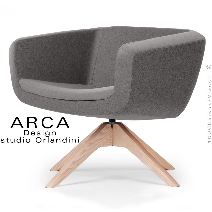 Fauteuil pour espace d'accueil lounge ARCA, structure interne en acier. Assise, dossier et accoudoirs garnis de mousse moulée et injectée à froid. Habillage tissu type feutre gamme ERA, 100% polyester du fabricant Camira, couleur au choix voir gamme fabricant. Piétement 4 branches en bois massif de Frêne, finition vernis naturel incolore ou peint au choix (suivant palette fabricant). Assise pivotant 360°, avec système de retour automatique. Avec tampons plastiques de protection des sols.