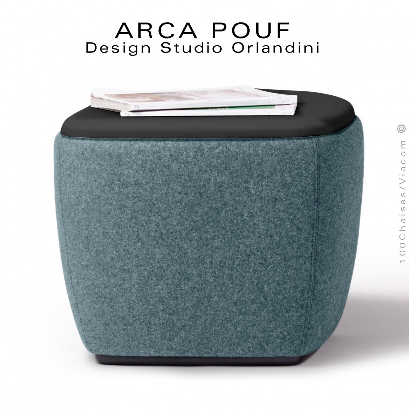 Pouf, repose-pieds, tabouret ARCA ou petite table d'appoint, structure bois avec une assise garnie de mousse injectée à froid. Base ou socle en bois peint noir, habillage tissu tissé gamme ERA, 100% polyester du fabricant Camira, couleurs au choix voir palette. Assise cuir couleur noir gamme Panama du fabricant DANI, (autre couleur possible au choix suivant palette fabricant, sur demande à commandes@100chaises.fr).