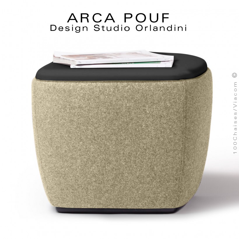 Pouf, repose-pieds, tabouret ARCA ou petite table d'appoint, structure bois avec une assise garnie de mousse injectée à froid. Base ou socle en bois peint noir, habillage tissu tissé gamme ERA, 100% polyester du fabricant Camira, couleurs au choix voir palette. Assise cuir couleur noir gamme Panama du fabricant DANI, (autre couleur possible au choix suivant palette fabricant, sur demande à commandes@100chaises.fr).