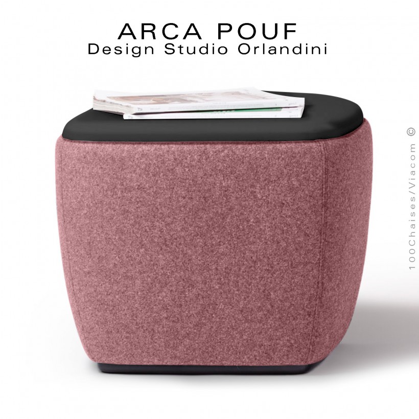 Pouf, repose-pieds, tabouret ARCA ou petite table d'appoint, structure bois avec une assise garnie de mousse injectée à froid. Base ou socle en bois peint noir, habillage tissu tissé gamme ERA, 100% polyester du fabricant Camira, couleurs au choix voir palette. Assise cuir couleur noir gamme Panama du fabricant DANI, (autre couleur possible au choix suivant palette fabricant, sur demande à commandes@100chaises.fr).