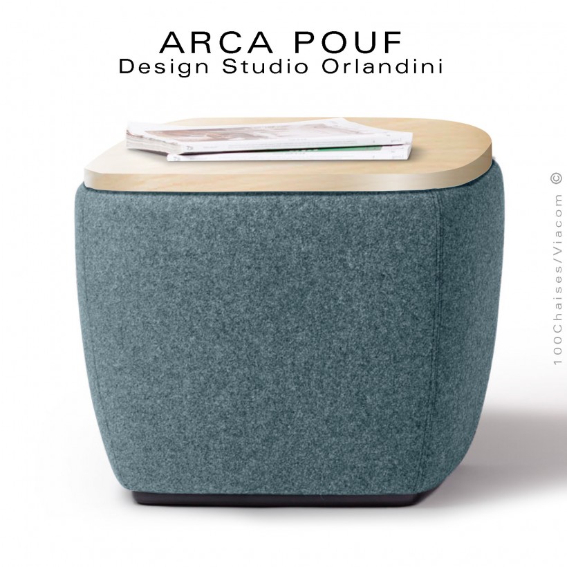 Pouf, repose-pieds ARCA, ou petite table d'appoint, bout de canapé, habillage 100% laine, plateau bois vernis.