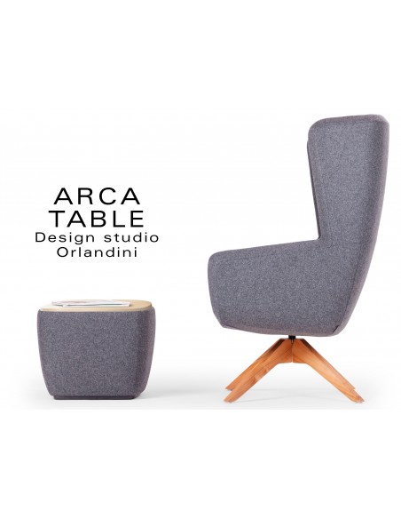 Normes européennesPouf, repose-pieds ARCA ou table d'appoint, bout de canapé. Structure et base ou socle en bois massif de Frêne, hauteur 42 cm., dimensions 50x50 cm. Finition socle peint noir (autre suivant gamme fabricant ou RAL sur demande). Habillage tissu tissé gamme ERA, 100% polyester du fabricant Camira, couleurs au choix voir palette nuancier. Plateau en bois massif de Frêne ou MDF, épaisseur 22 mm., finition vernis nature incolore ou peint (voir palette peinture fabricant). Autre finition plateau possible sur commande. Avec tampons plastiques de protections des sols.