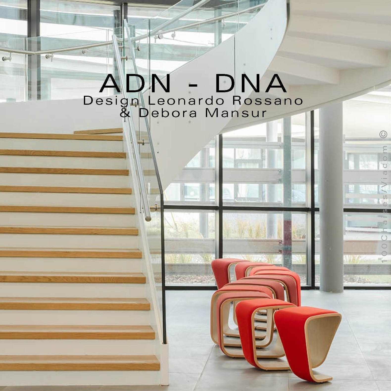 Aménagez un espace d'accueil aussi convivial qu’original grâce au banc modulaire DNA. Inspiré des formes dynamiques de la modélisation moléculaire de deux brins d’ADN, ce banc design se compose d'un seul élément de contreplaqué de bois courbé ou de tôle d'acier. En résulte un meuble atypique avec une forme d’hélice offrant une assise confortable. Robuste, disponibles dans de nombreuses déclinaisons, ce banc trouvera sa place les environnements d'accueil tels que les halls d'entrée ou les salles d’attente en intérieur mais aussi en extérieur pour le modèle acier. La banquette droite peut être réalisée avec un minimum de 3 modules de sièges, jusqu'à 7 places linéaire. Le banc DNA est également disponible dans une version ou l'assise reçoit de la mousse et l'habillage d'un tissu de choix. N’hésitez pas à nous contacter afin de nous faire part de vos projets d’aménagement. Nous pourrons vous conseiller sur les nombreuses configurations offertes par le banc DNA.