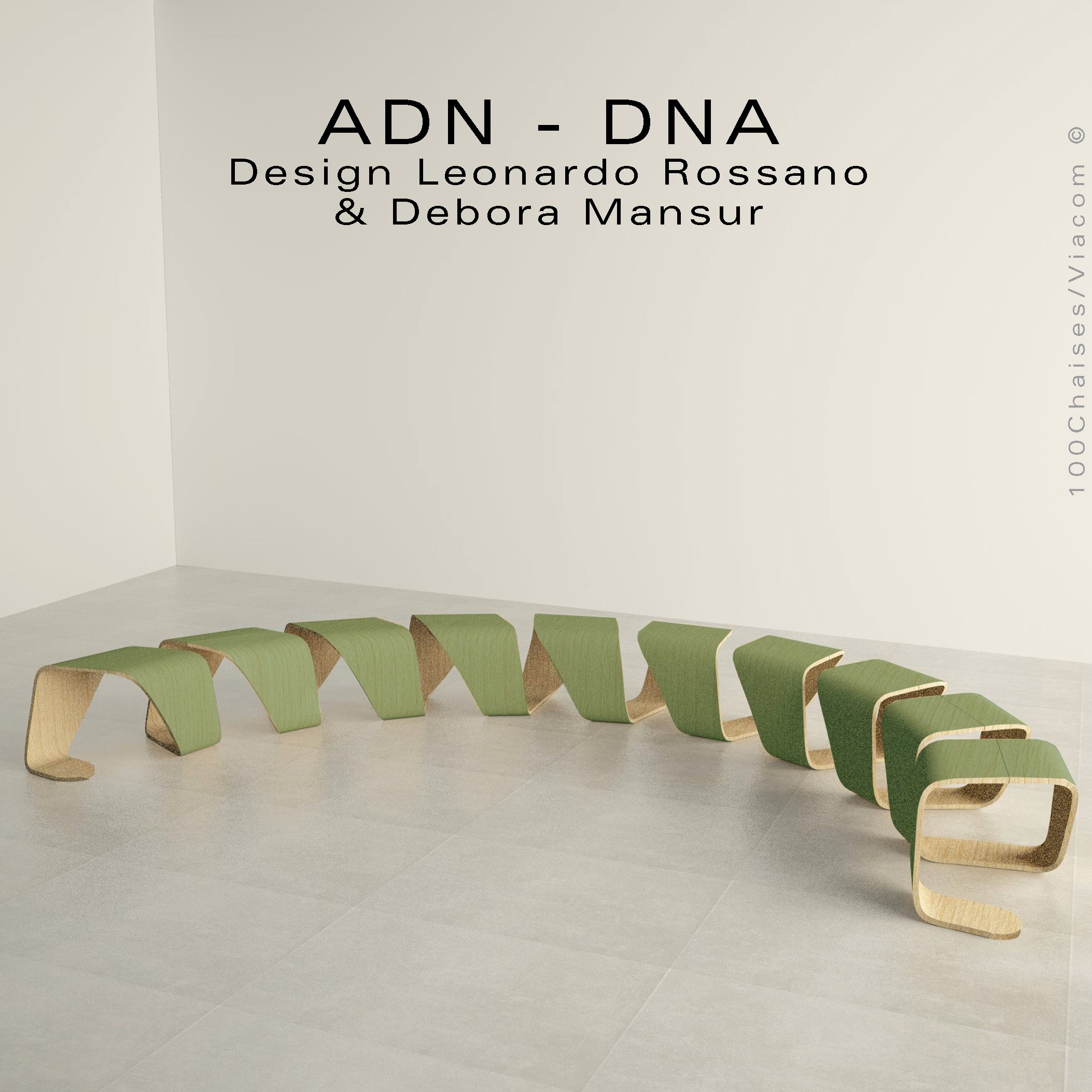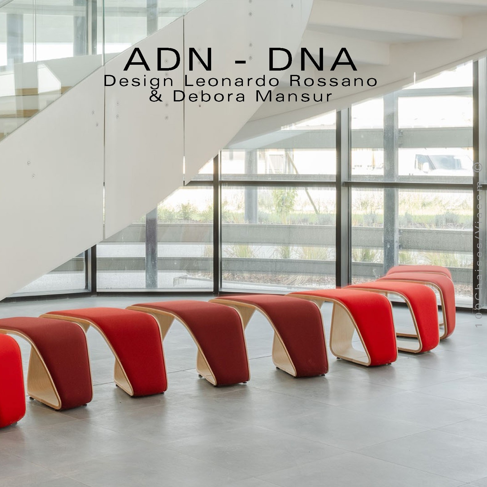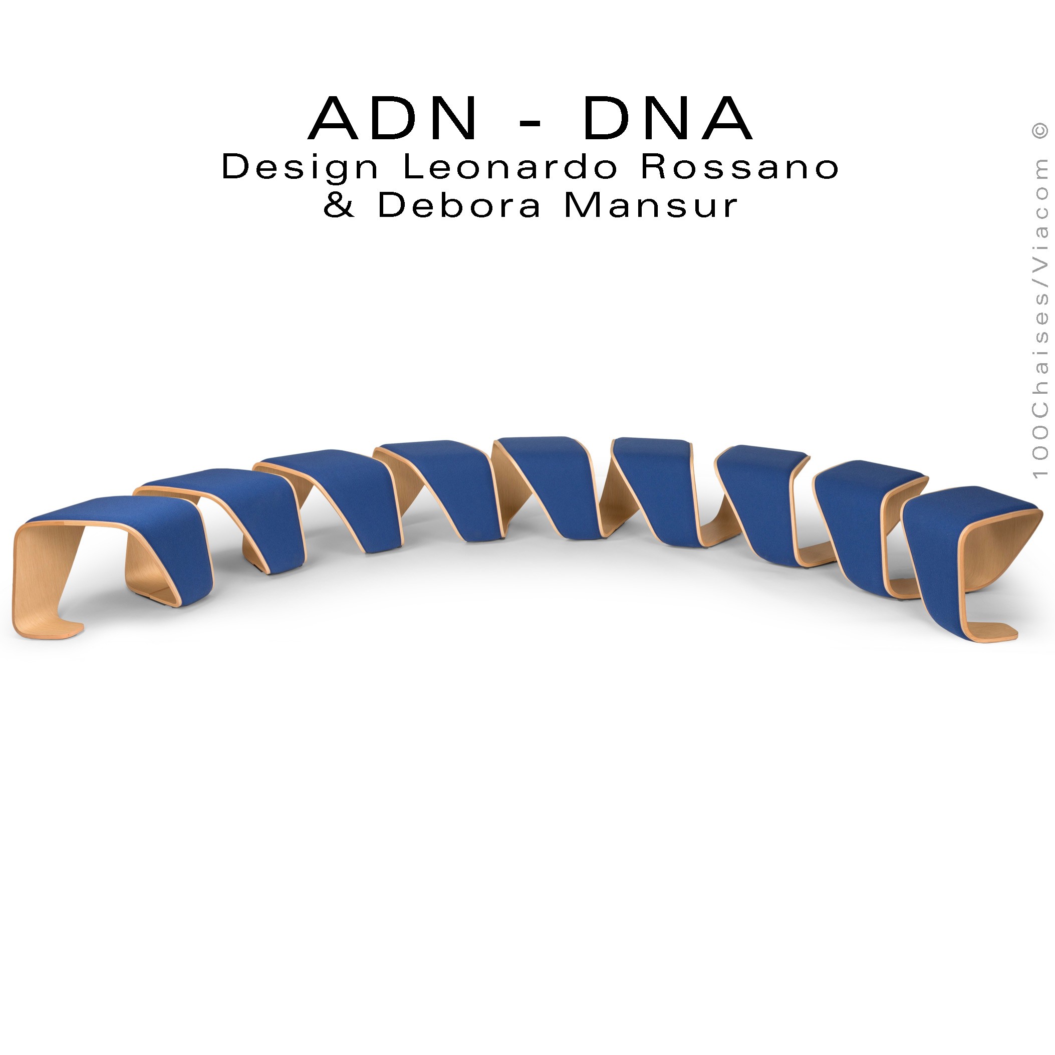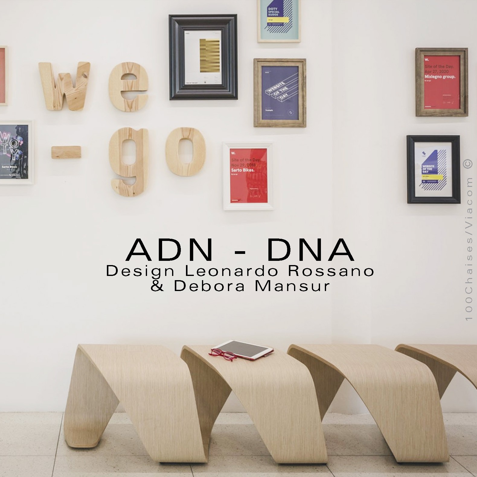 Aménagez un espace d'accueil aussi convivial qu’original grâce au banc modulaire DNA. Inspiré des formes dynamiques de la modélisation moléculaire de deux brins d’ADN, ce banc design se compose d'un seul élément de contreplaqué de bois courbé ou de tôle d'acier. En résulte un meuble atypique avec une forme d’hélice offrant une assise confortable. Robuste, disponibles dans de nombreuses déclinaisons, ce banc trouvera sa place les environnements d'accueil tels que les halls d'entrée ou les salles d’attente en intérieur mais aussi en extérieur pour le modèle acier. La banquette droite peut être réalisée avec un minimum de 3 modules de sièges, jusqu'à 7 places linéaire. Le banc DNA est également disponible dans une version ou l'assise reçoit de la mousse et l'habillage d'un tissu de choix. N’hésitez pas à nous contacter afin de nous faire part de vos projets d’aménagement. Nous pourrons vous conseiller sur les nombreuses configurations offertes par le banc DNA.